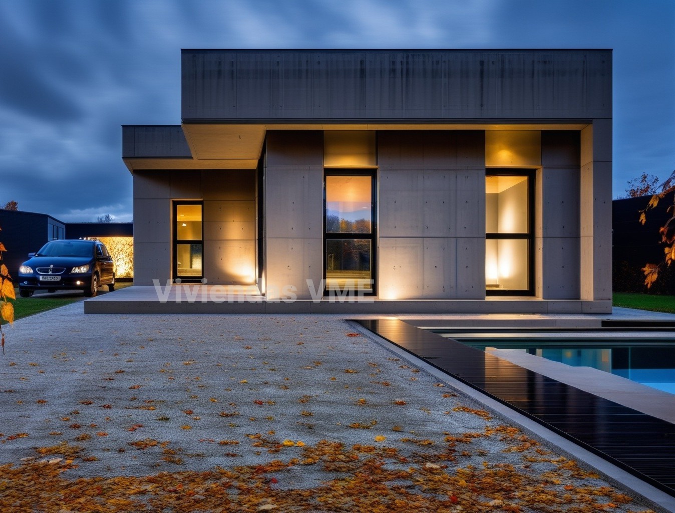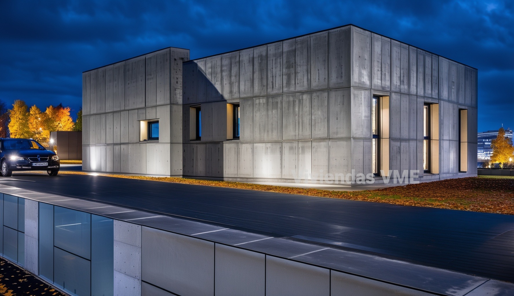Las viviendas modernas con fachada de hormigón destaca por sus grandes ventanales, techos altos y su diseño moderno y llamativo.