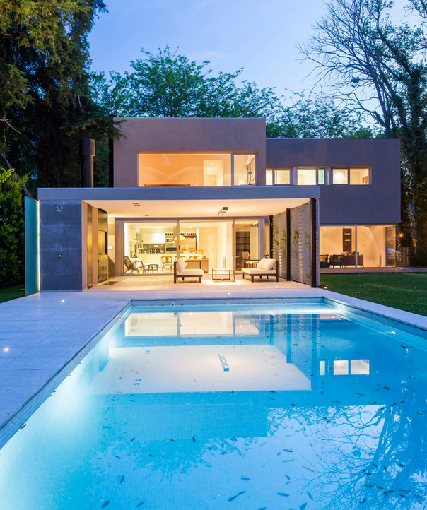 Es una Vivienda con fachada de hormigón y grandes ventanales.