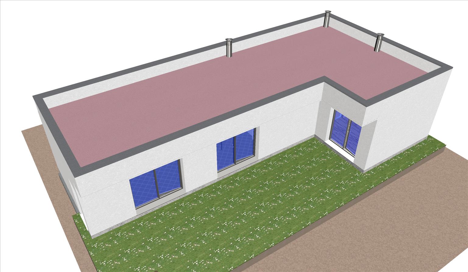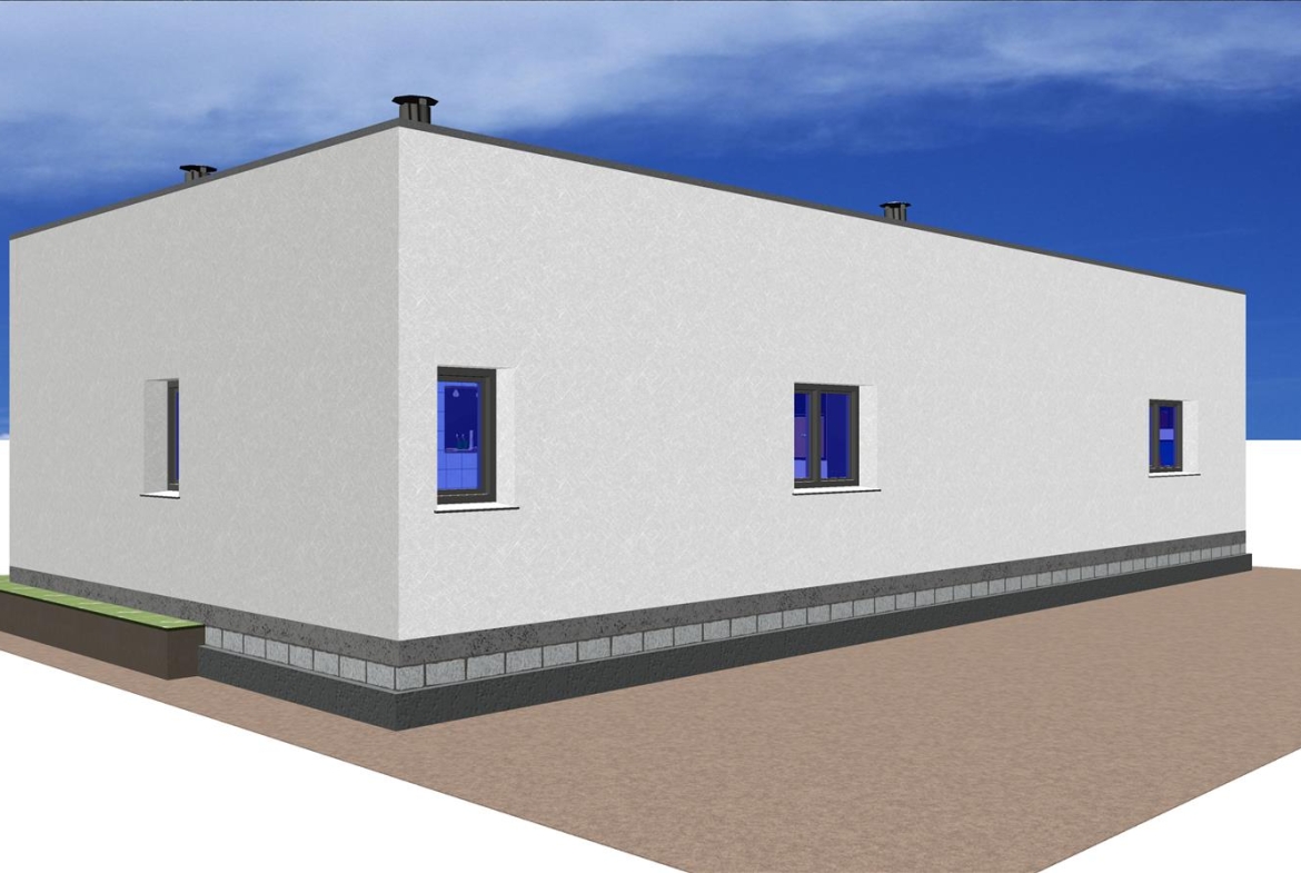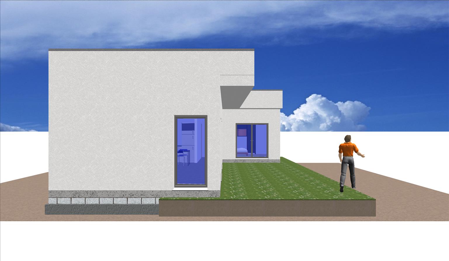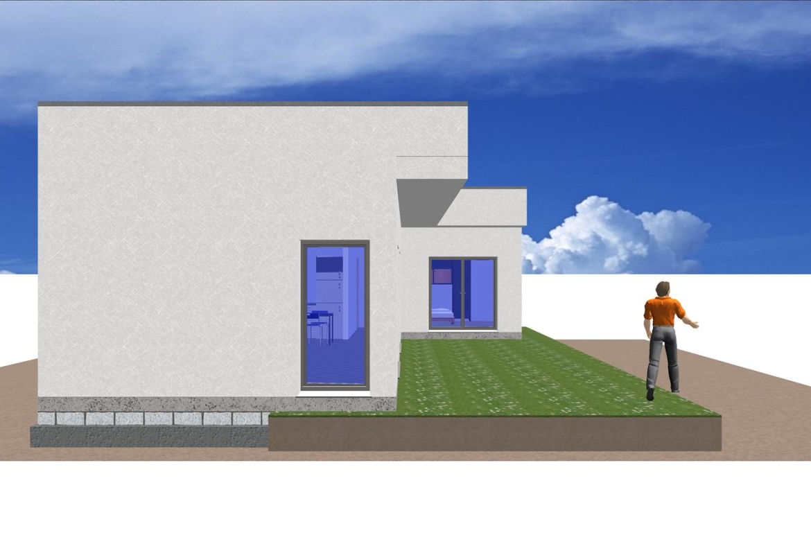 Se trata de una casa con fachada de hormigón, moderna, prefabricada con un área común en un espacio abierto, 2 dormitorios y 2 baños.