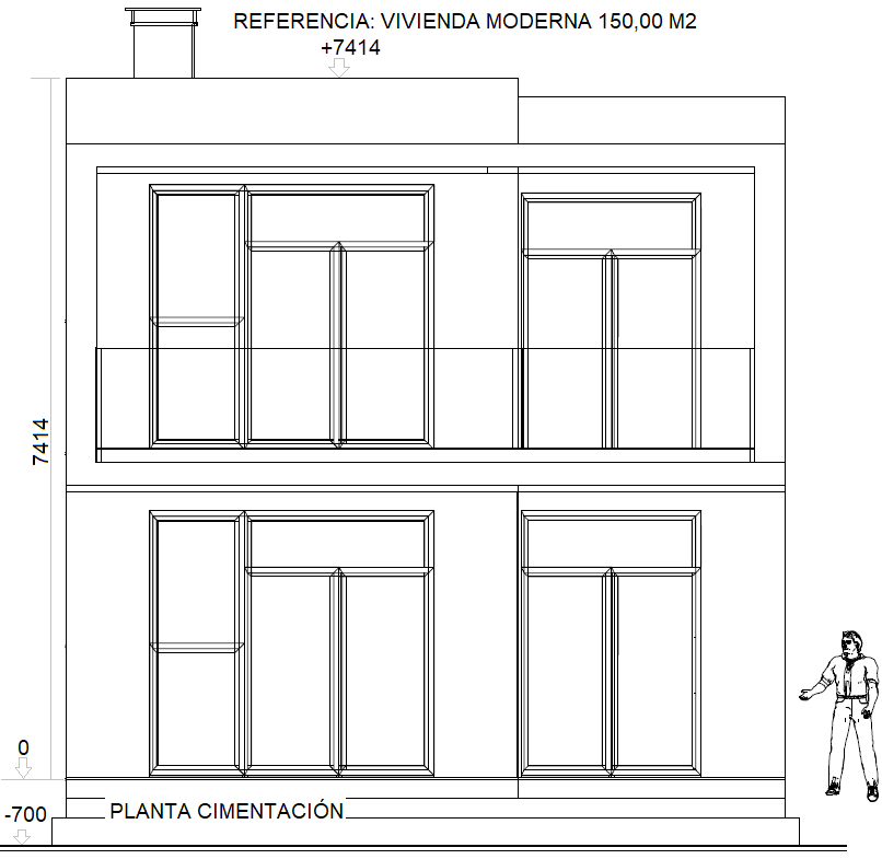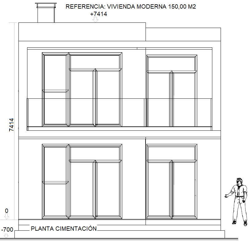 El modelo Granada 150 m2 es una acogedora vivienda prefabricada moderna con fachada de hormigón y grandes ventanales.