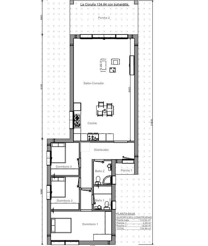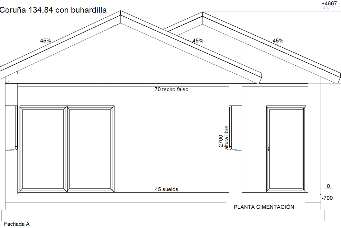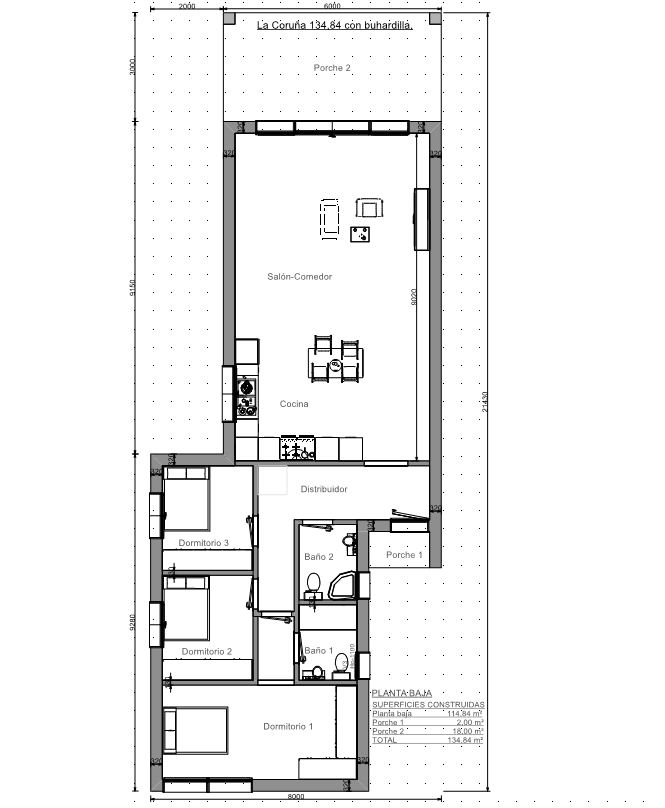 Casa prefabricada La Coruña 134 m2, acabada en hormigón, con 3 dormitorios, 2 baños, salón, cocina y porche.