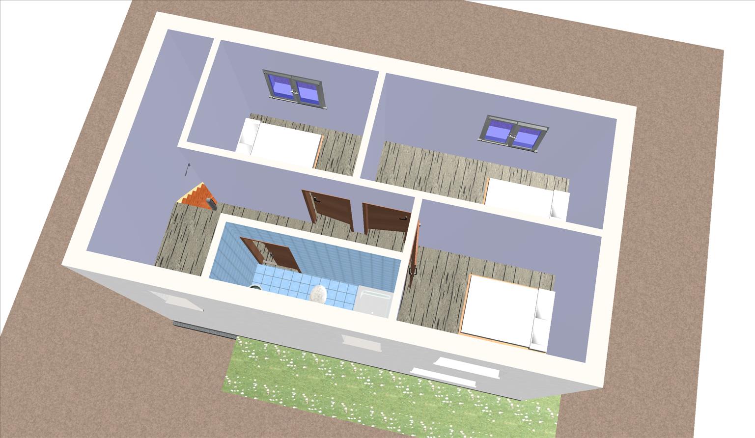 En la planta superior de la vivienda prefabricada Segovia 90m2 se desarrolla un programa de tres dormitorios con un baño con la cubierta inclinada.