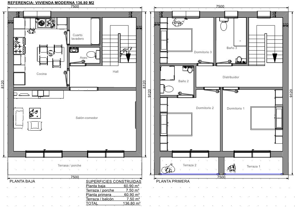 El modelo de casa prefabricada Sevilla 136,80, dispone de 3 dormitorios y 2 baños, 1 aseo, salón, cocina, cuarto lavadero, 1 porche y dos terrazas.