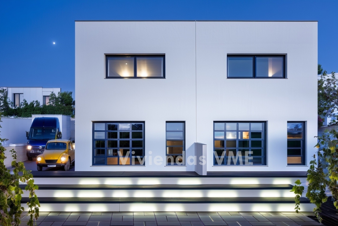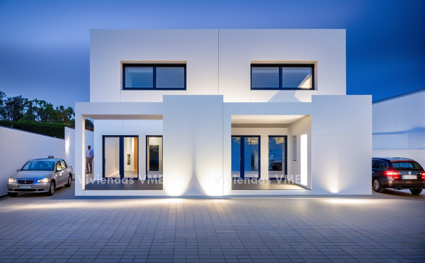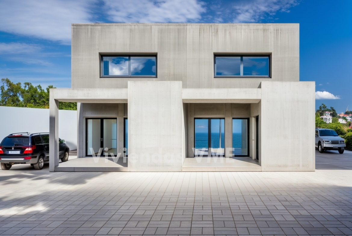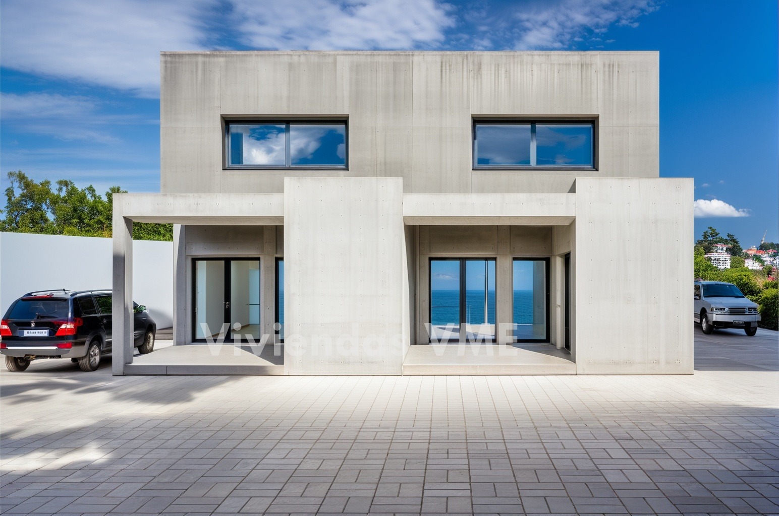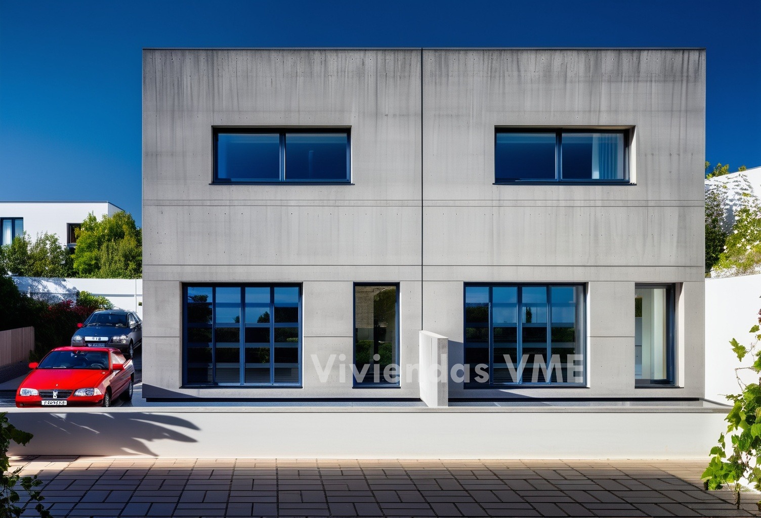 Casas entre medianeras modernas con garaje y patio interior con fachada de hormigón coloreado de alta calidad.