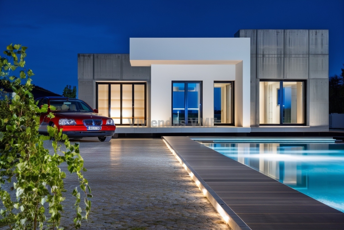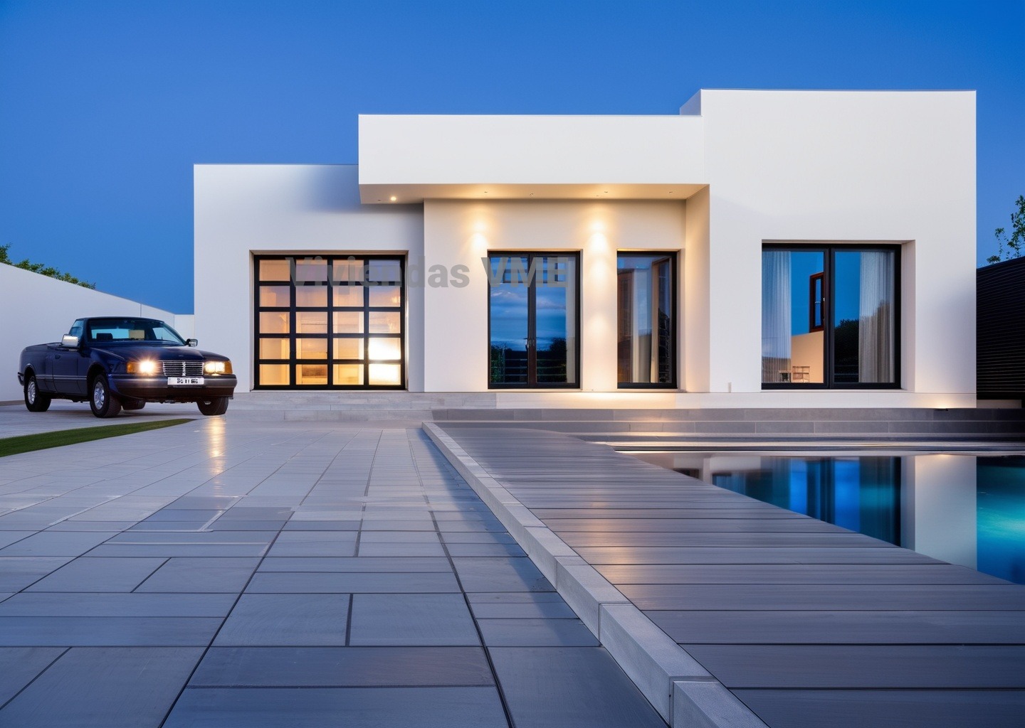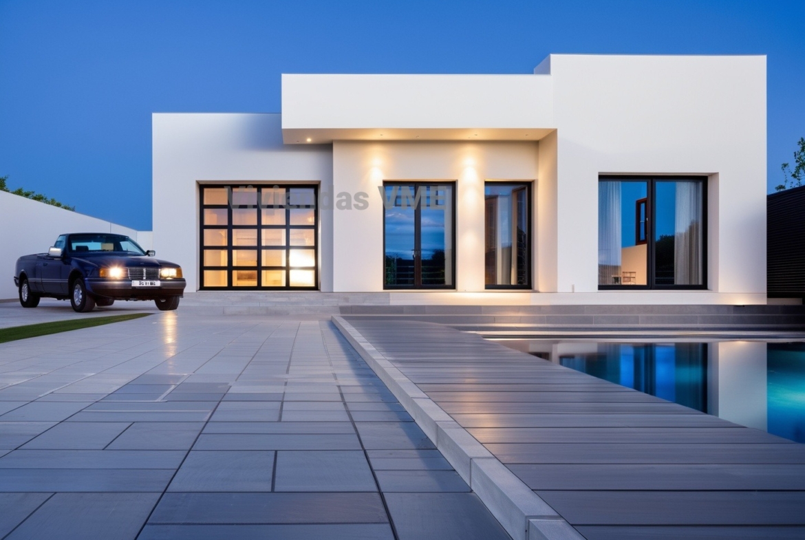 Se trata de una casa de diseño moderno, de estilo mediterráneo minimalista actual.