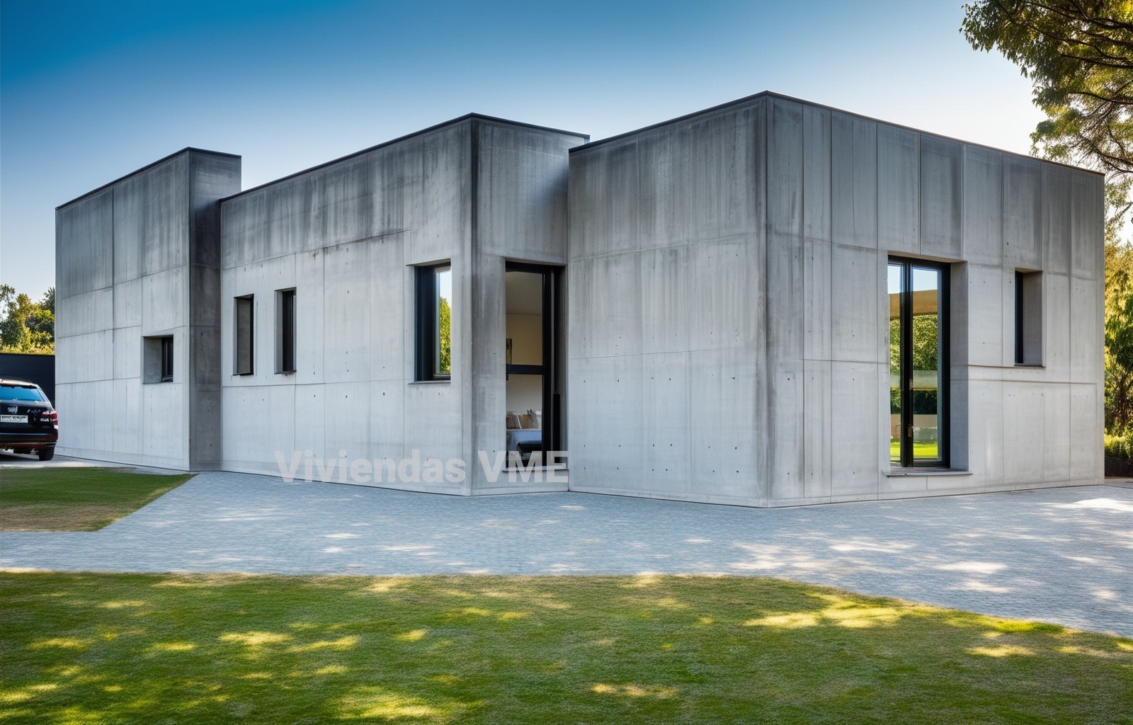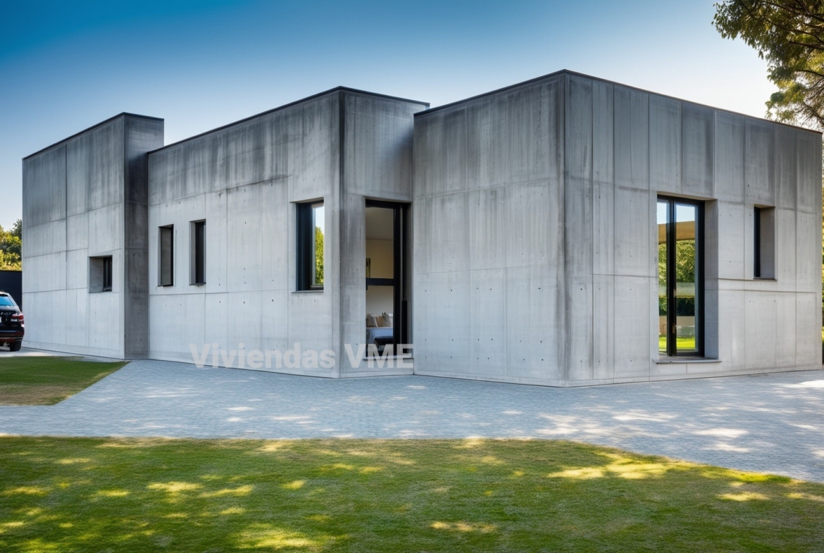 Casas modernas con 4 dormitorios y garajes de 145m2. Echa un vistazo a esta moderna casa prefabricada con fachada de hormigón y grandes ventanas.