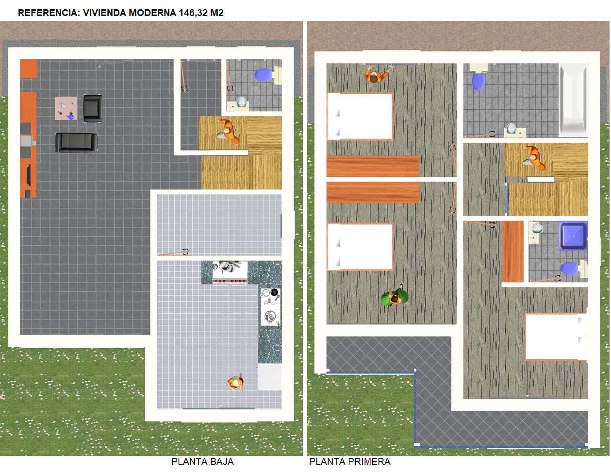 En la planta alta, tres amplios dormitorios, dos baños y una terraza amplia para los dormitorios 1 y 2.