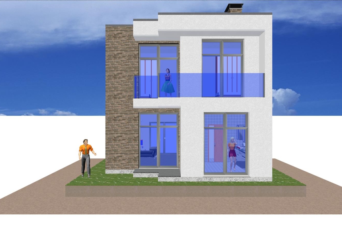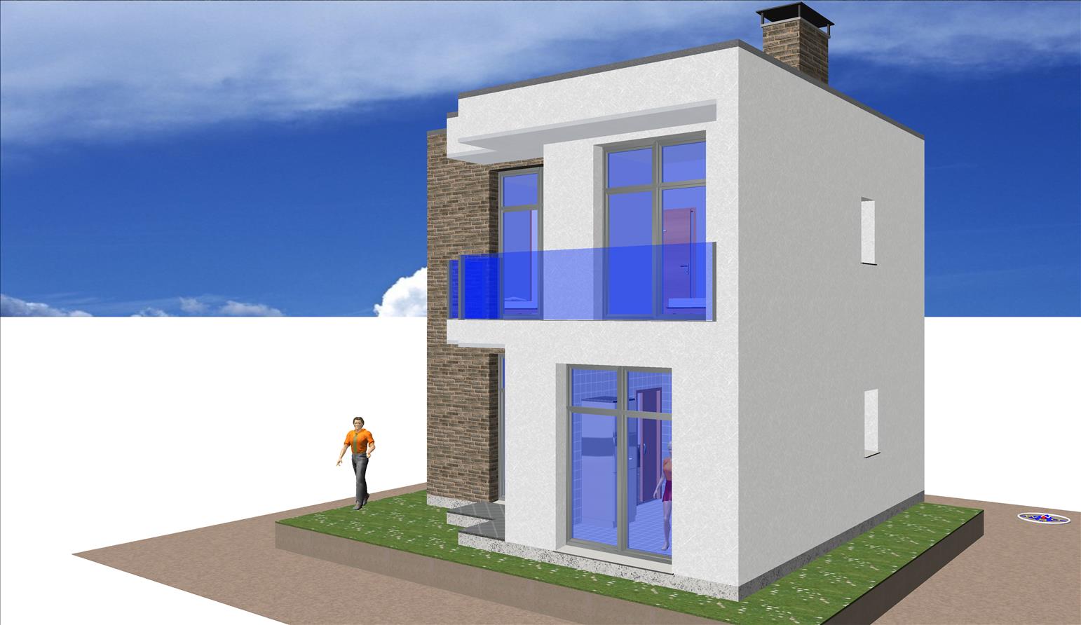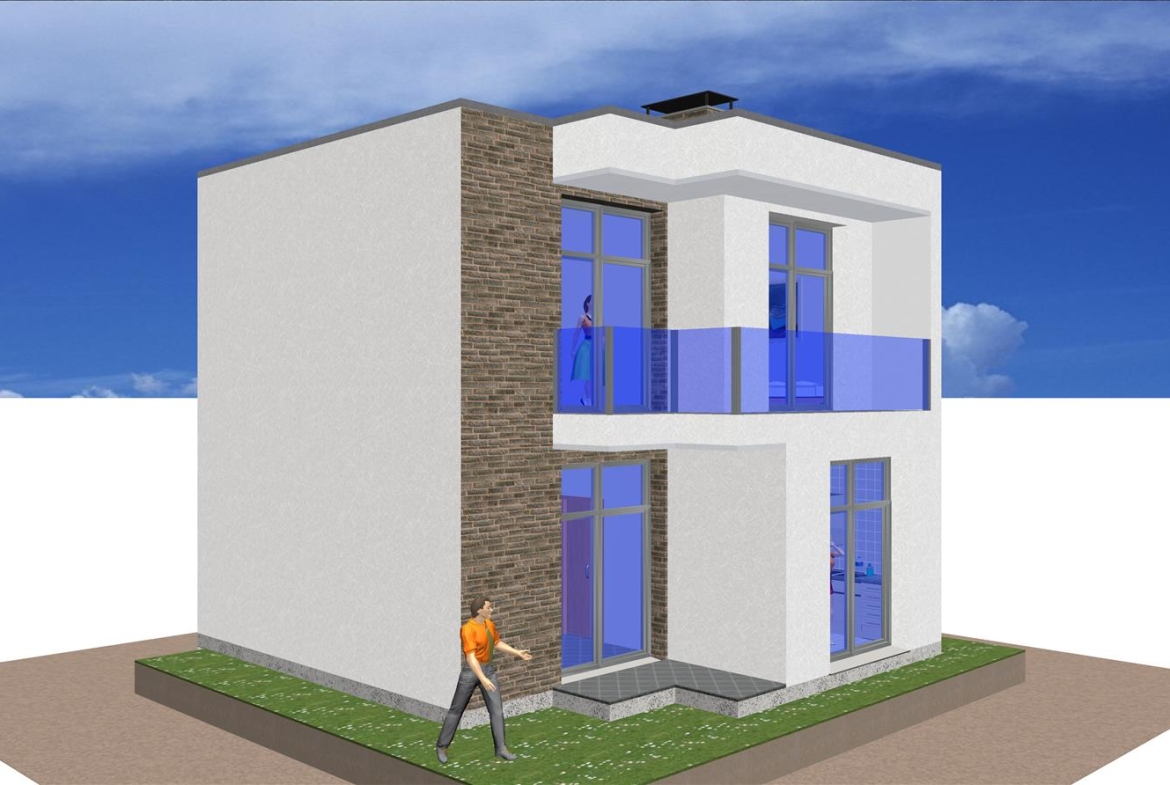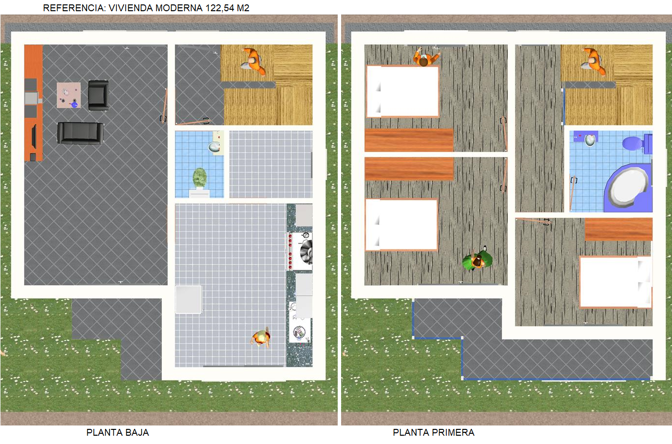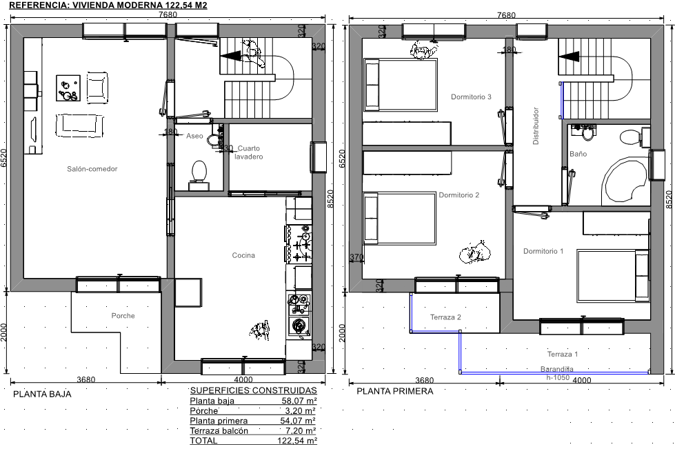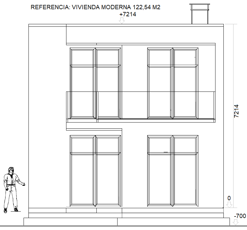 Este modelo de 122,54 m2 construidos, es una casa prefabricada moderna con fachada de hormigón y grandes ventanas, se distribuye en dos niveles.