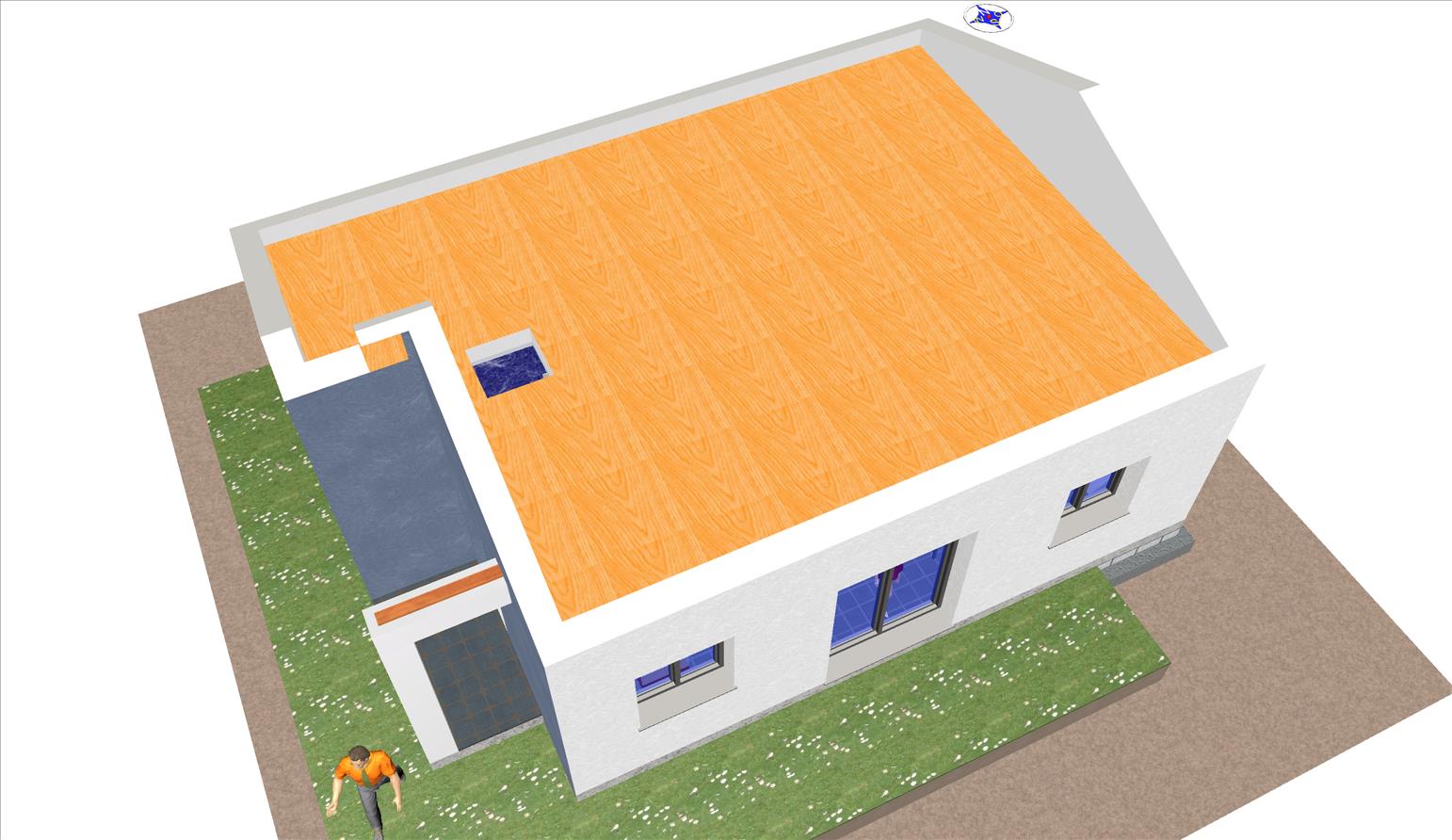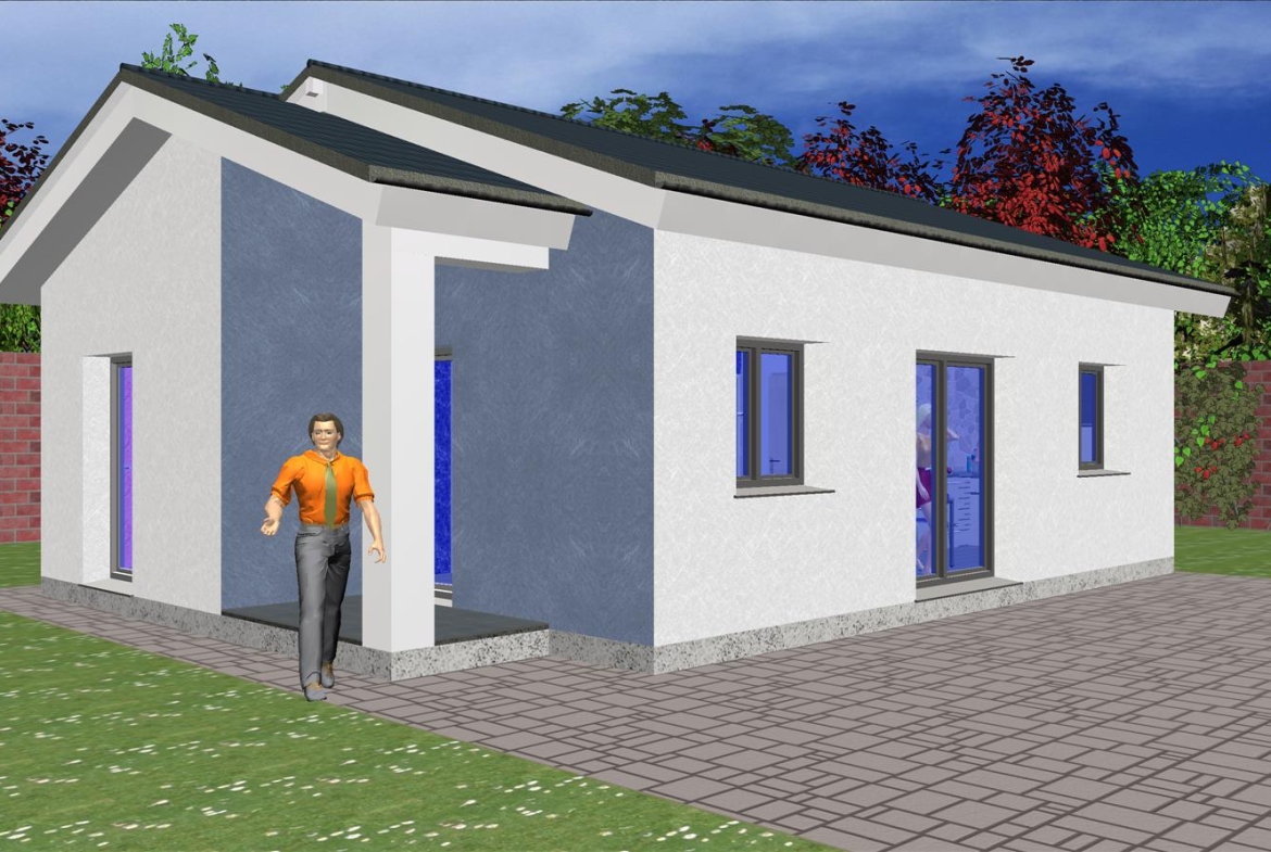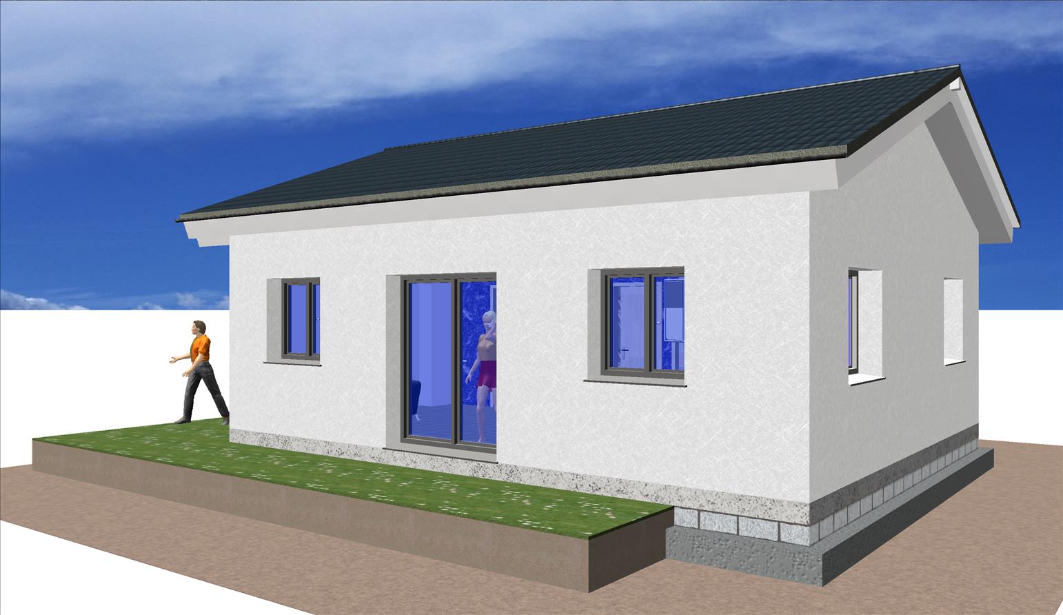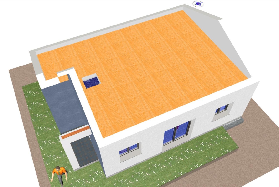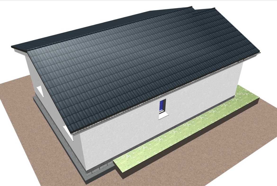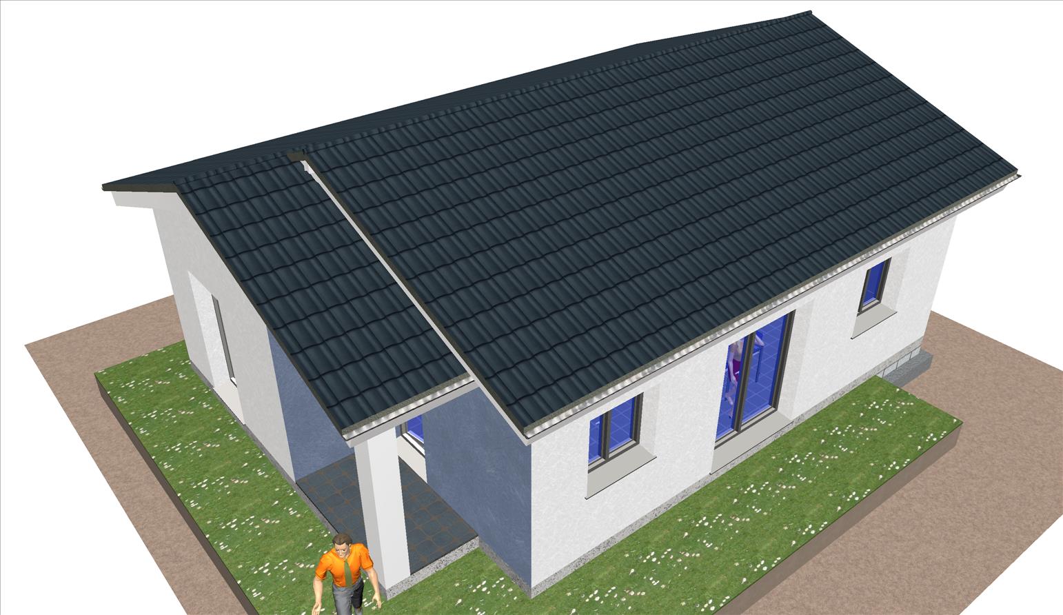 Casa prefabricada con la teja puesta, acabado final en fachadas de hormigón con sistema SATE y revestimiento en cemento coloreado.