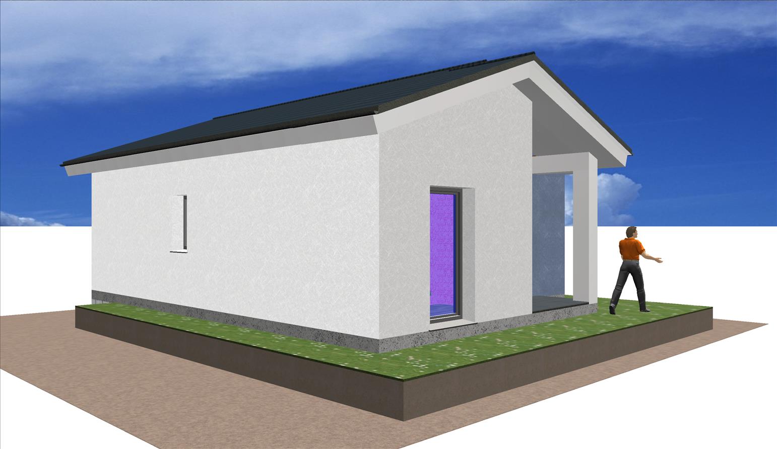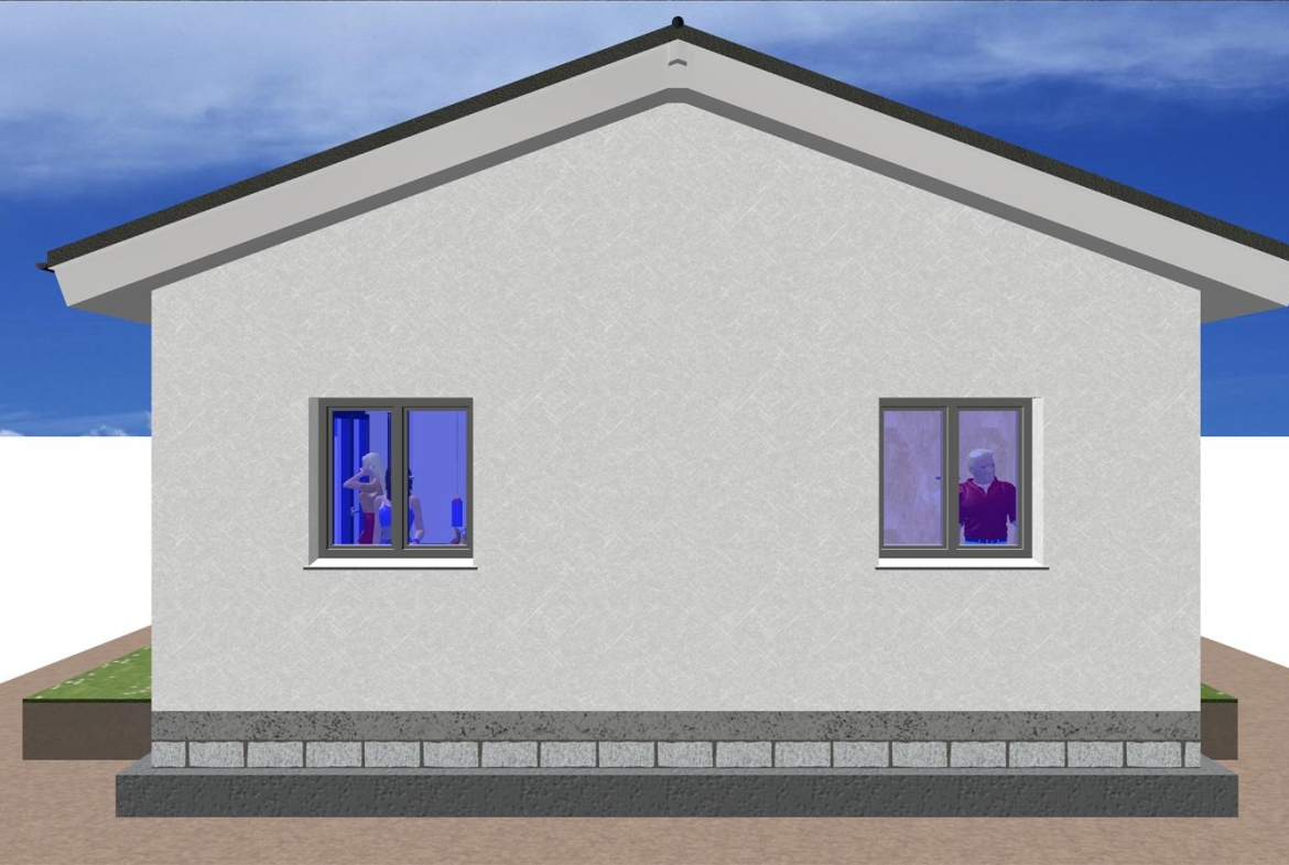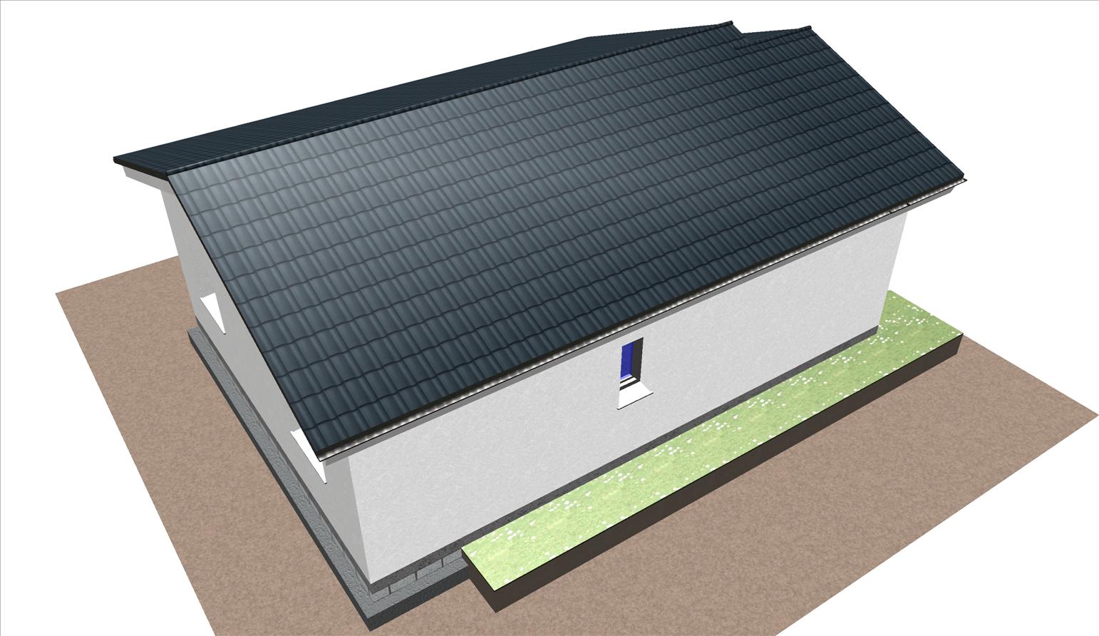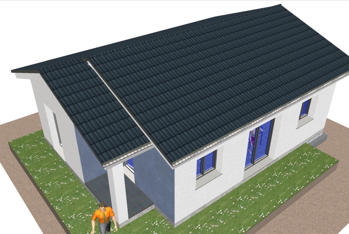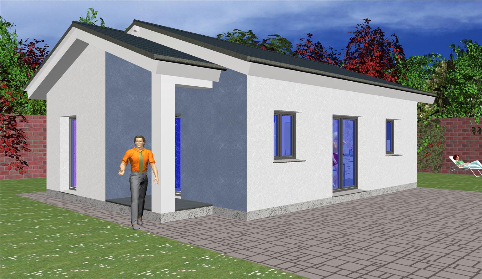 Casa prefabricada con la teja puesta, acabado final en fachadas de hormigón con sistema SATE y revestimiento en cemento coloreado.