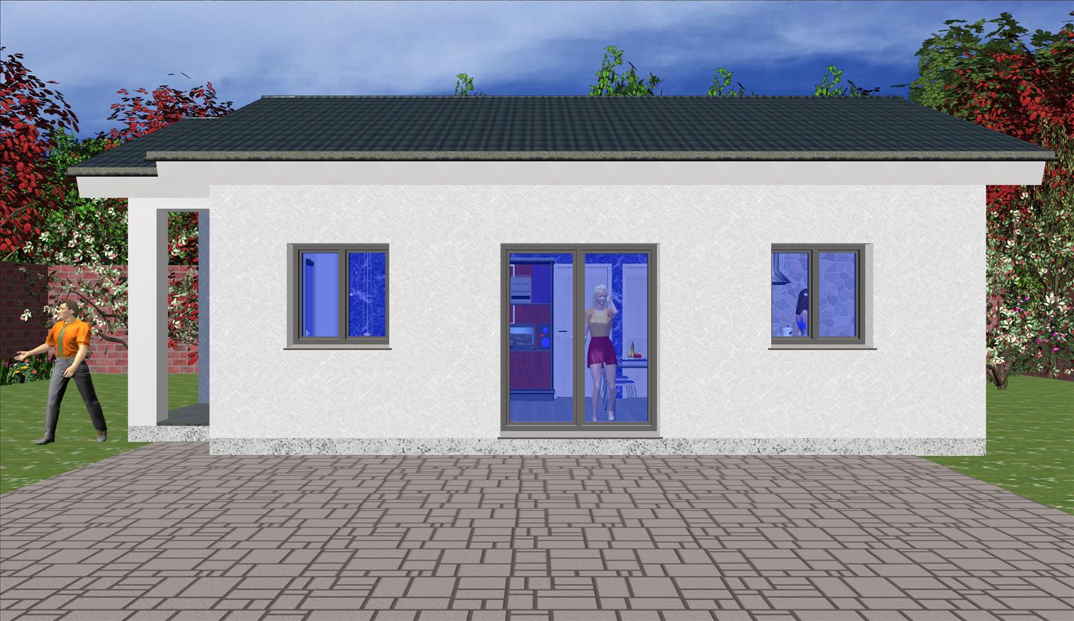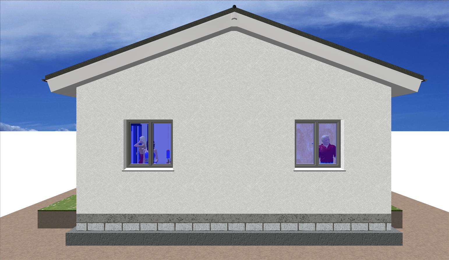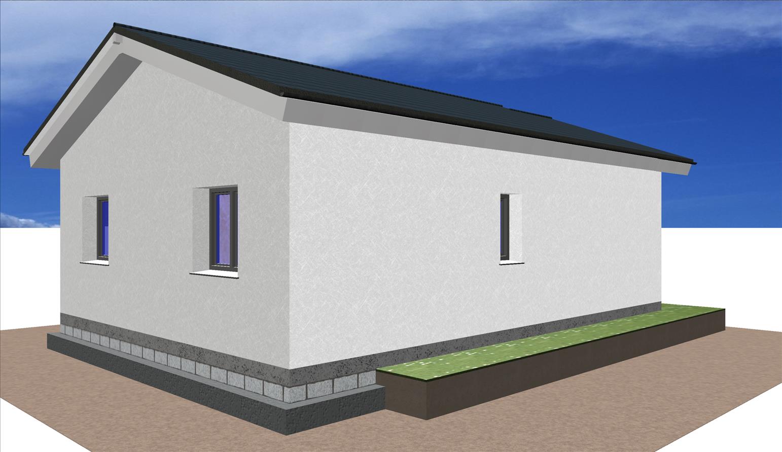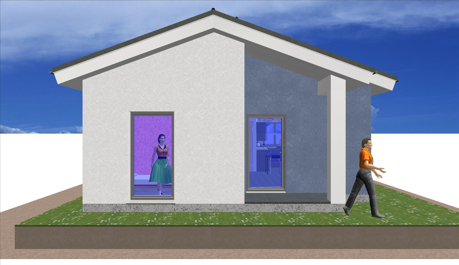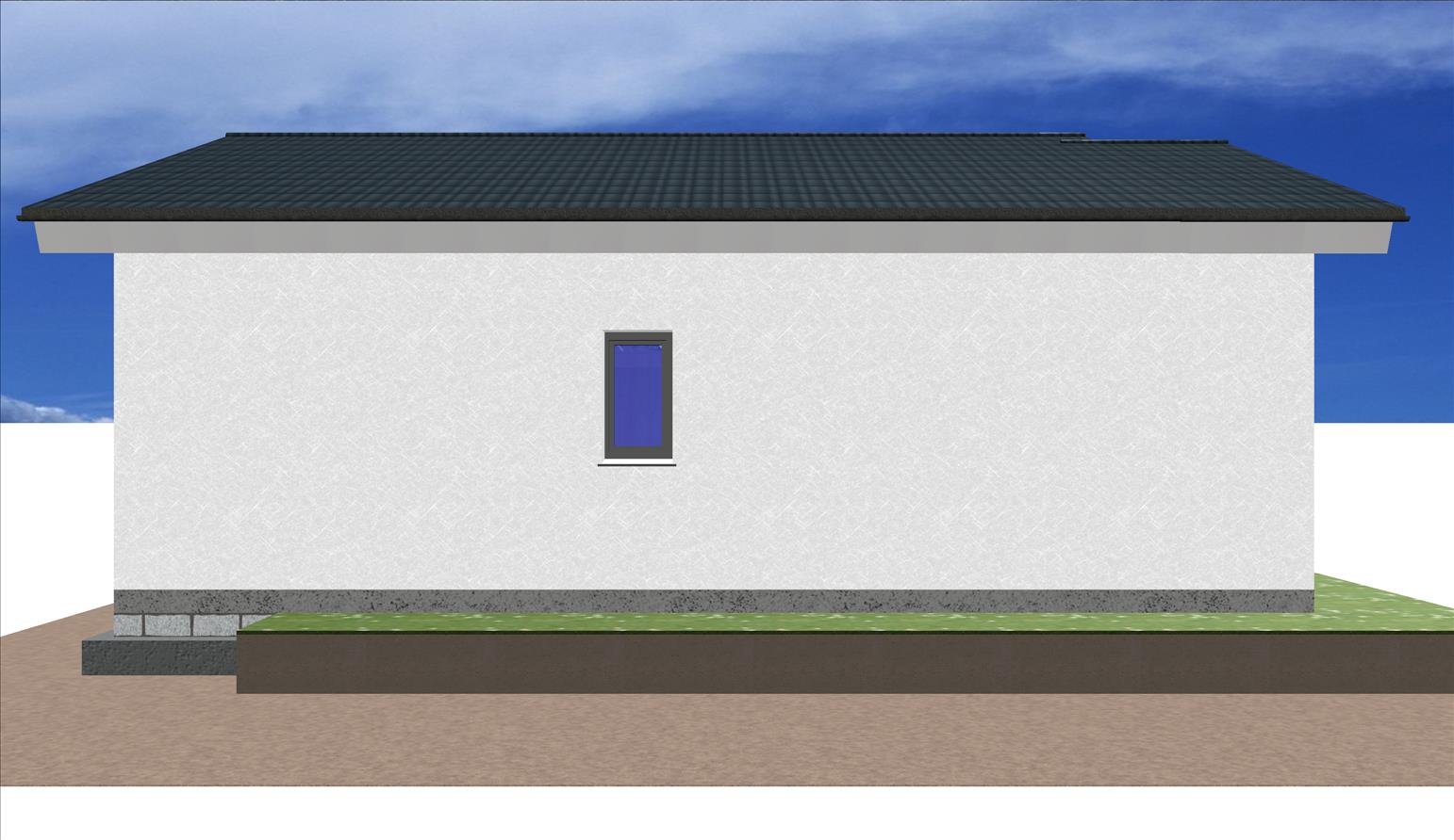 Casa prefabricada con la teja puesta, acabado final en fachadas de hormigón con sistema SATE y revestimiento en cemento coloreado.