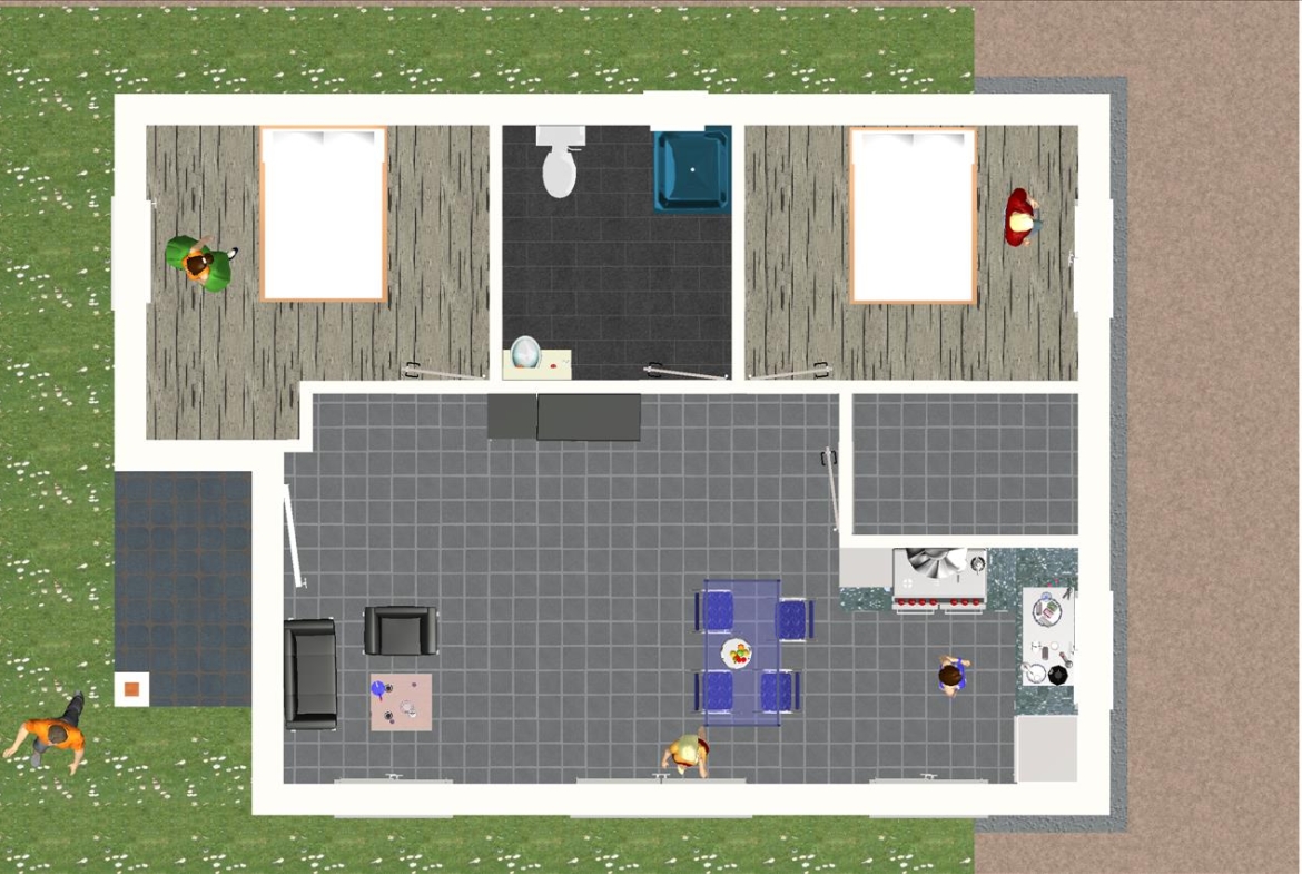 Planta baja, un amplio salón-comedor con cocina americana, despensa, dos dormitorios, un baño y porche.
