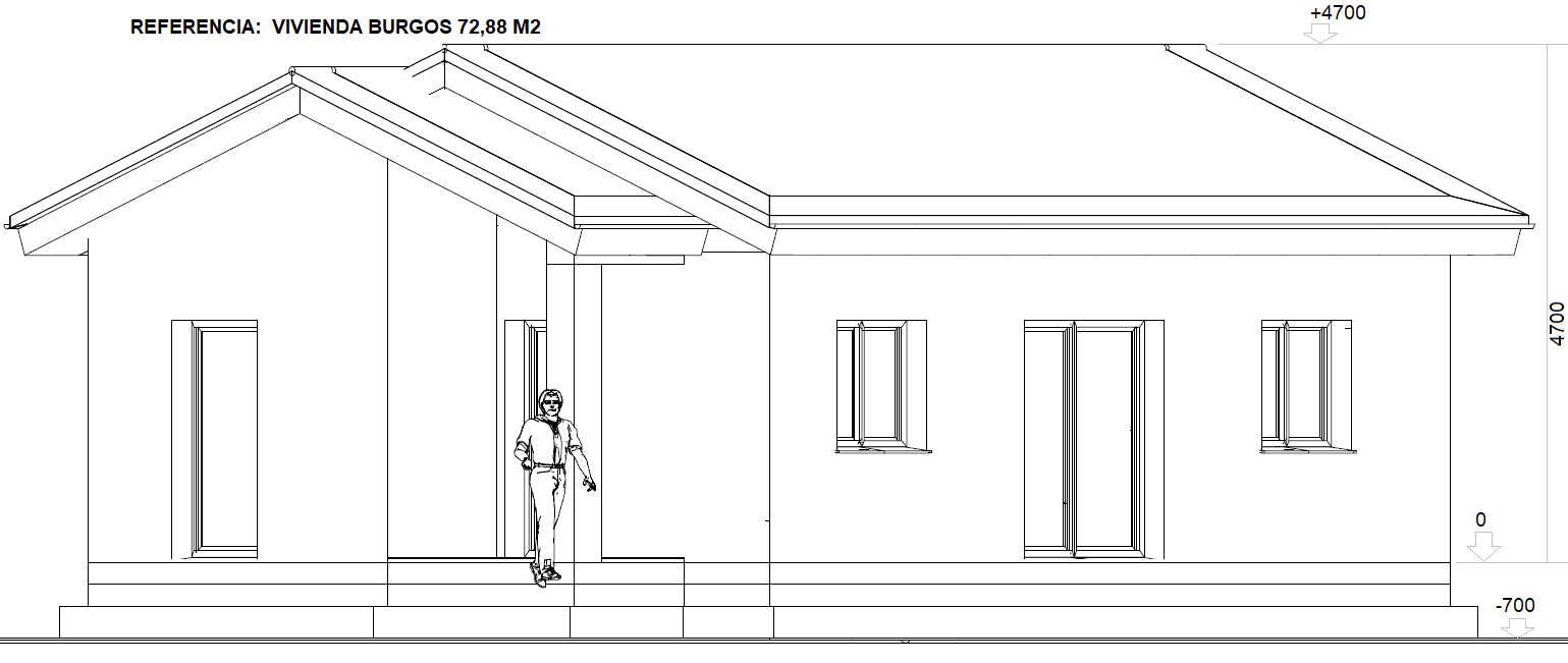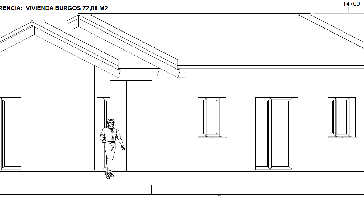 Es una casa prefabricada construida en Burgos en año 2018, con techo inclinado y fachada de hormigón.