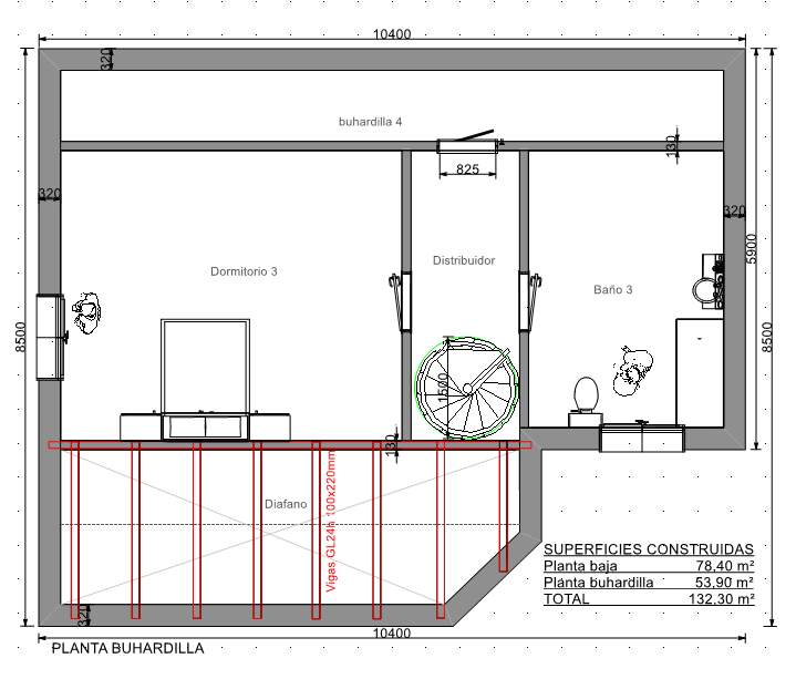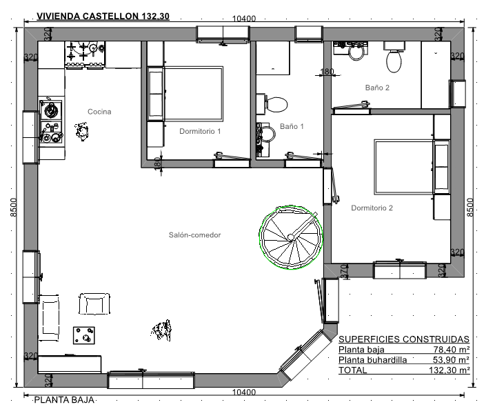 Es una vivienda con cubierta inclinada en planta baja con 2 dormitorios, cocina y un salón en doble altura espectacular y una planta primera abuhardillada muy acogedora con 1 dormitorio y un baño amplio.
