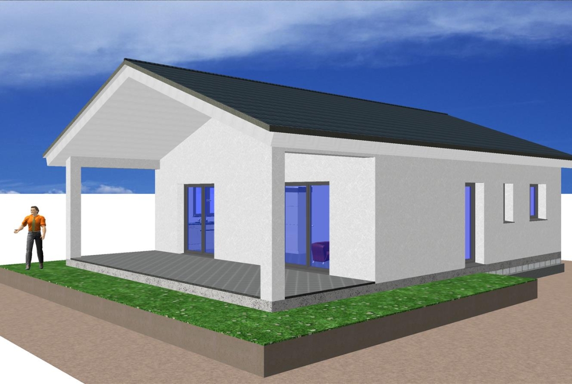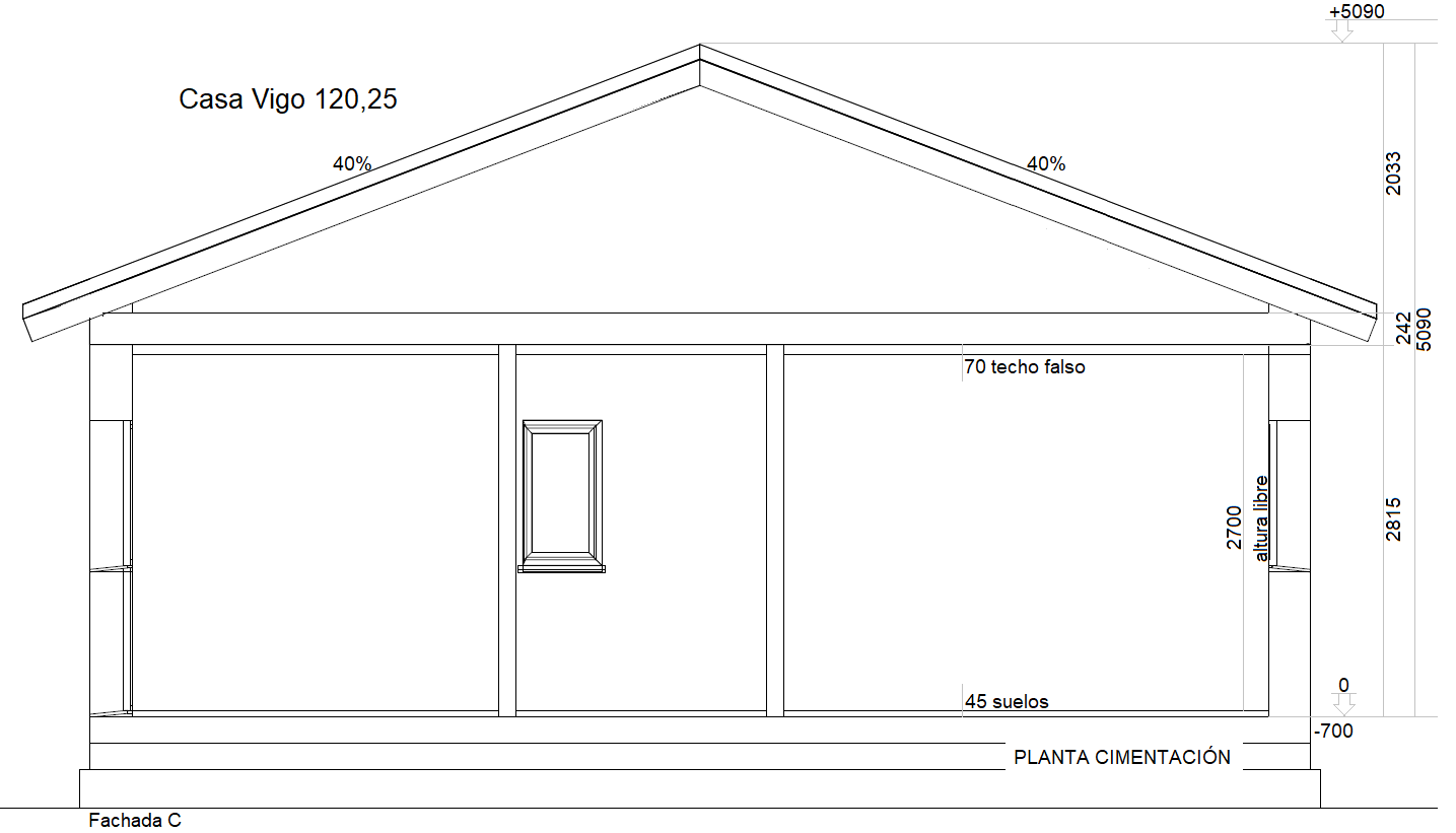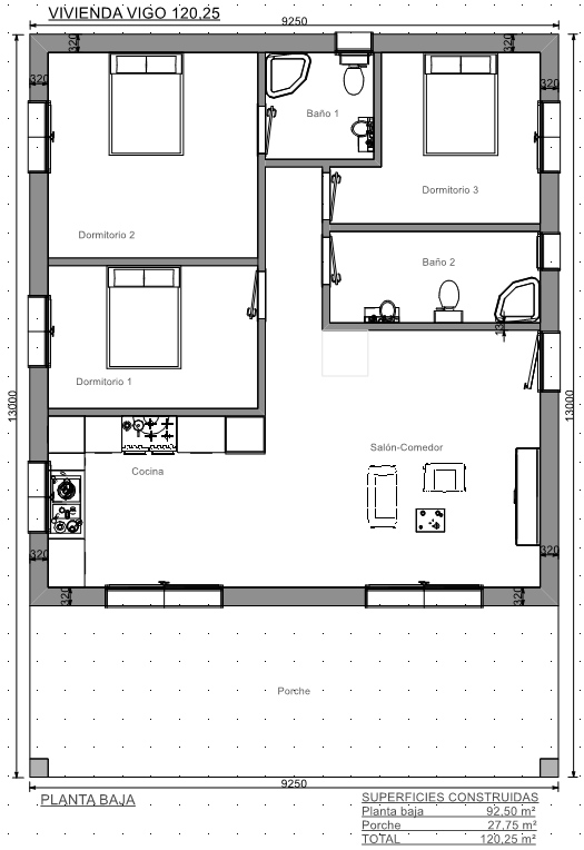 Casa prefabricada Vigo 120m2 acabada en hormigón, con 3 dormitorios, 2 baños, salón, cocina y porche.