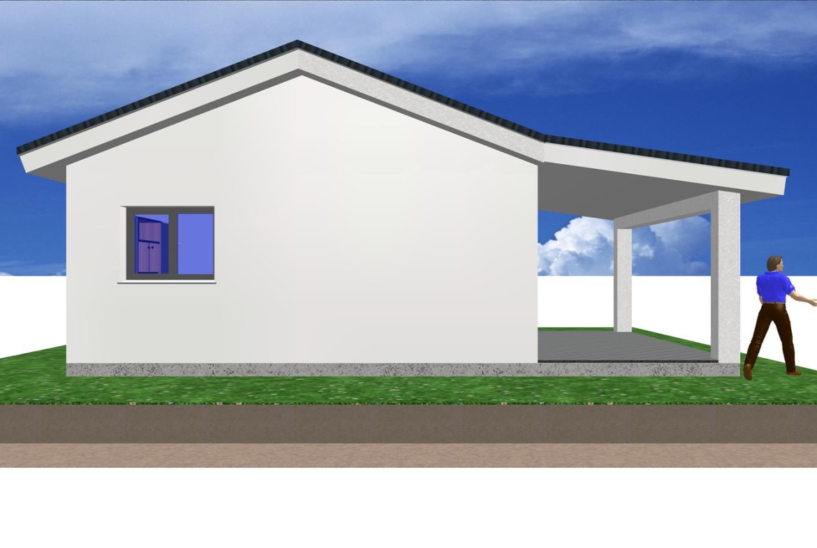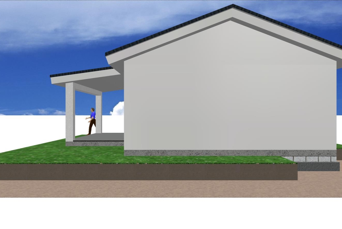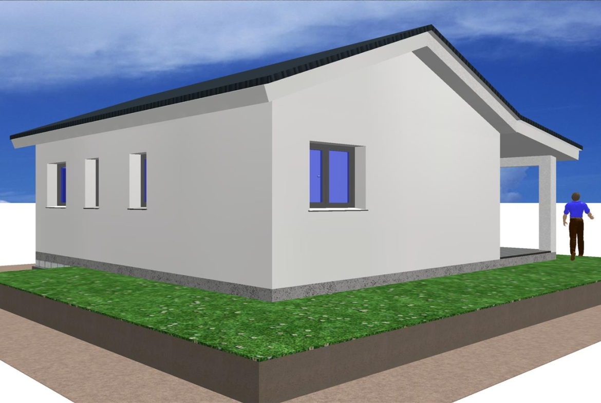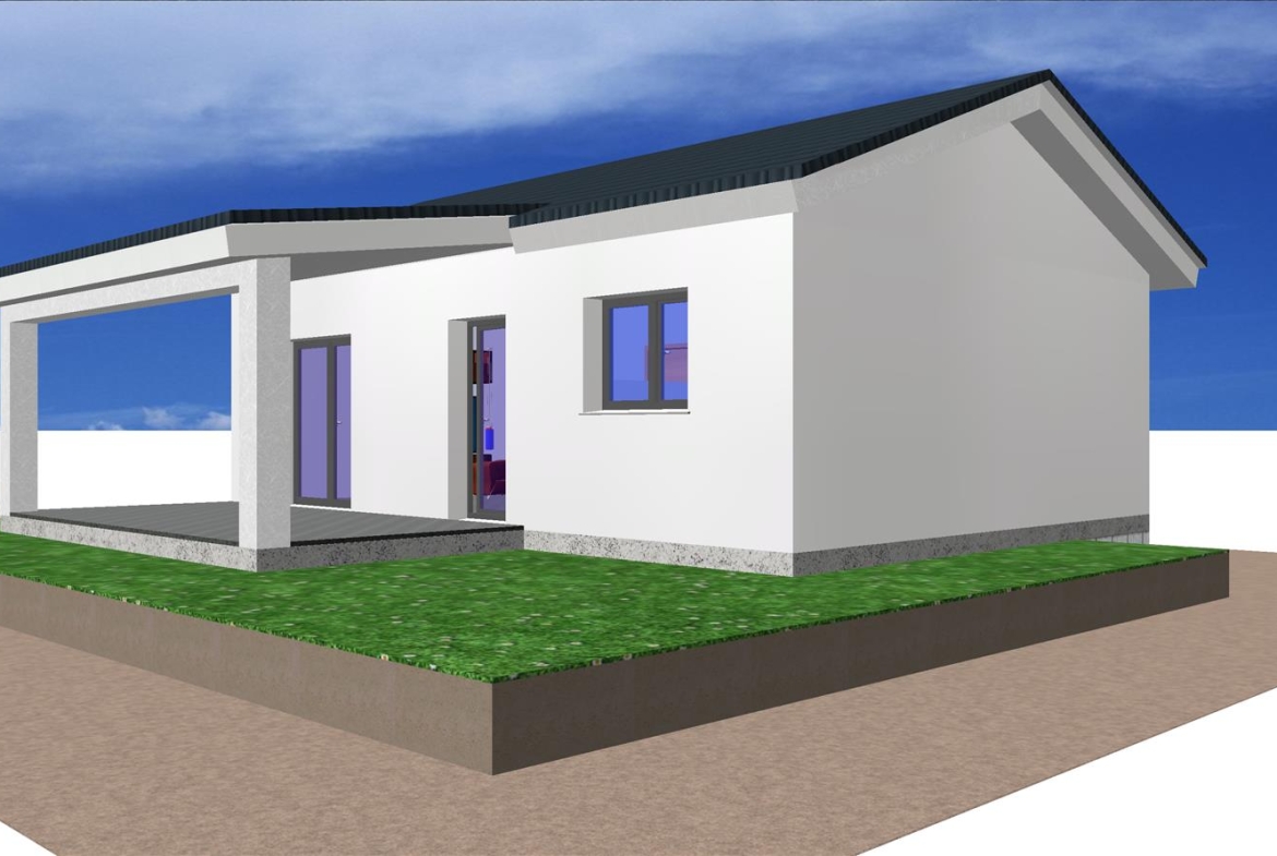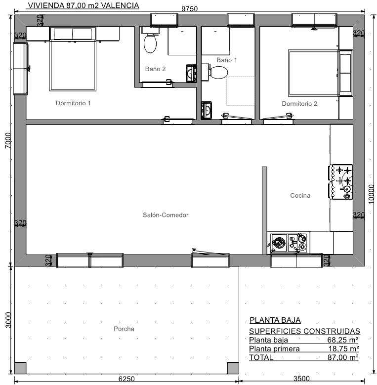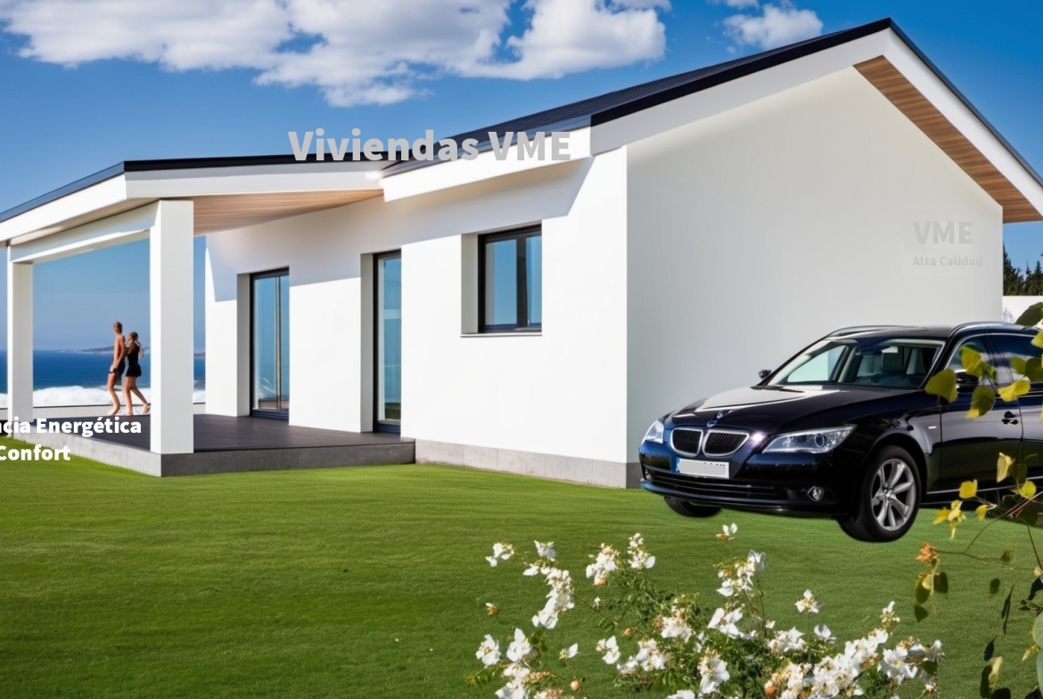 Se trata de una casa prefabricada de diseño totalmente personalizada en planta baja con dos dormitorios, dos baños, un amplio salón, cocina y porche.