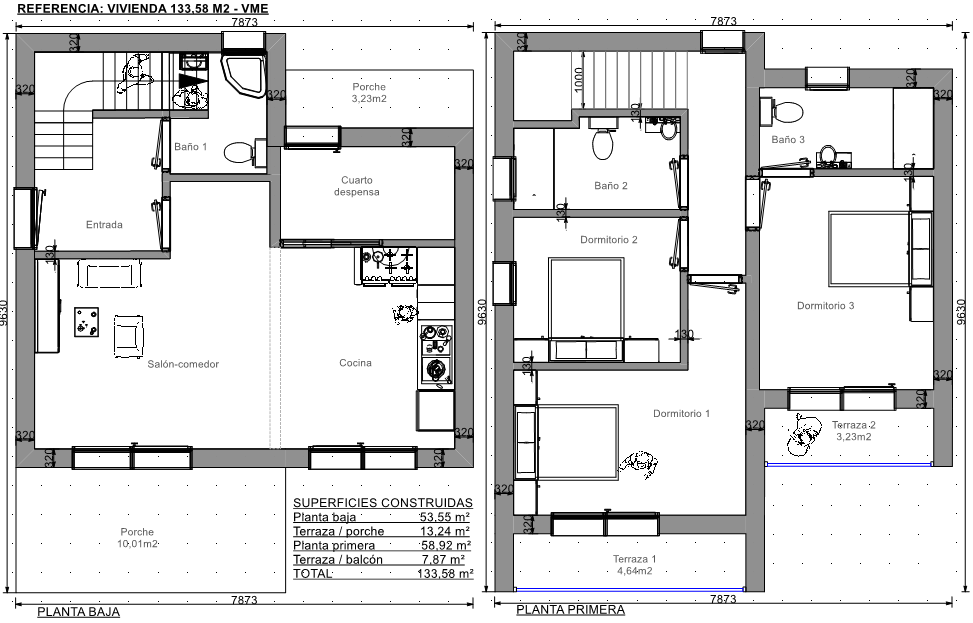 Vivienda pasiva con fachada de hormigón de alta calidad de 133,58m2 con 3 dormitorios y 3 baños.