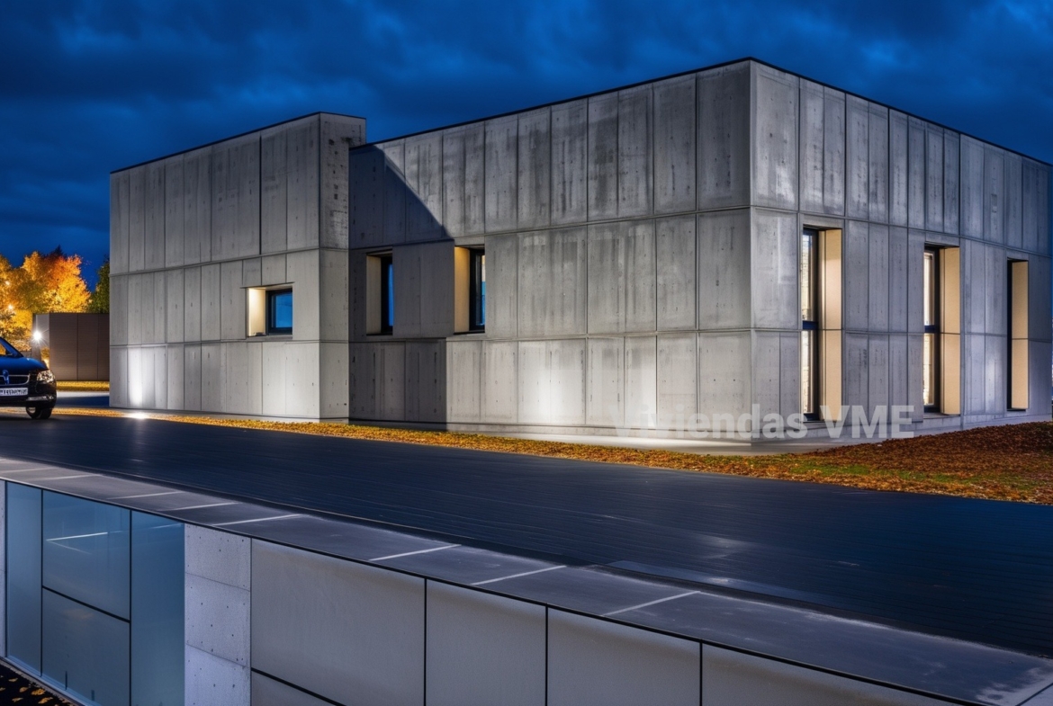 Las viviendas modernas con fachada de hormigón destaca por sus grandes ventanales, techos altos y su diseño moderno y llamativo.