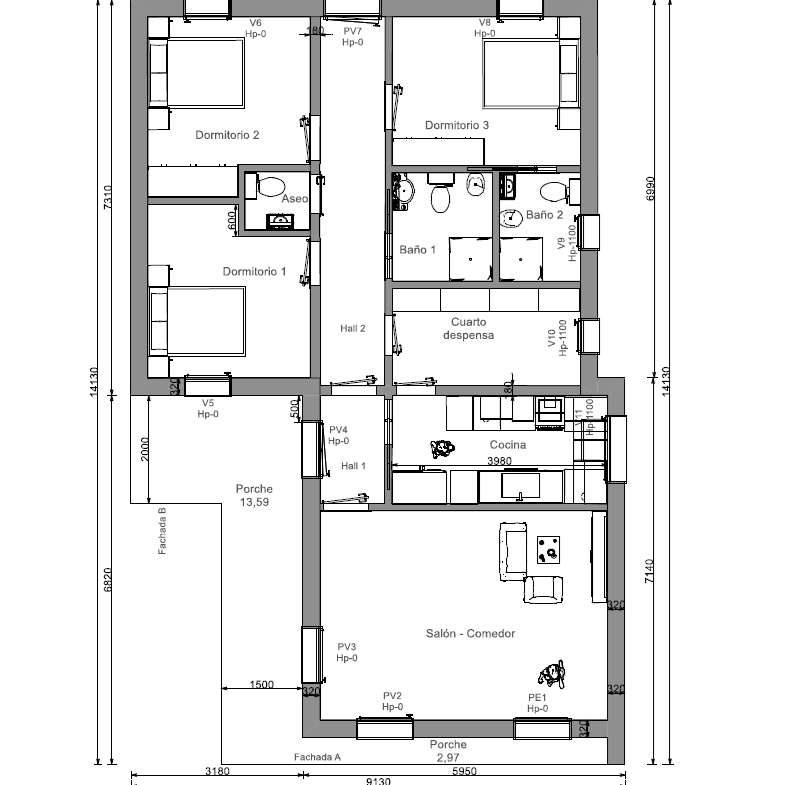 Distribución: 3 dormitorios, salón comedor, cocina, cuarto – despensa, 2 baños, 1 aseo y porche.