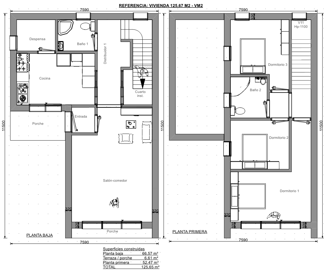 Vivienda con fachada de hormigón, con 3 dormitorios, 2 baños, cocina, despensa y porche.