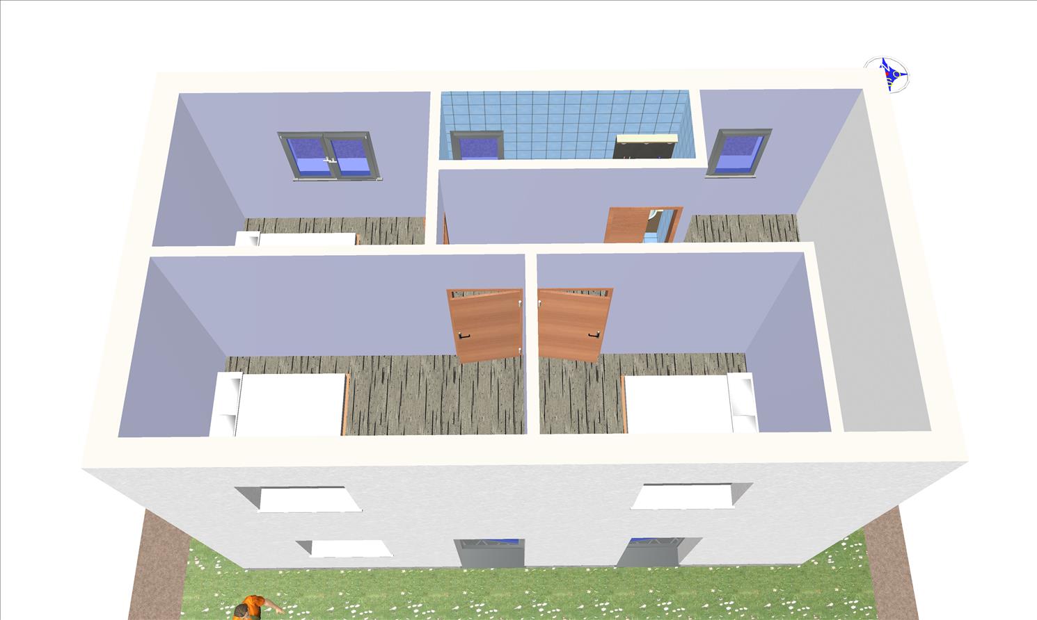 En la planta superior de la vivienda prefabricada Segovia 90m2 se desarrolla un programa de tres dormitorios con un baño con la cubierta inclinada.