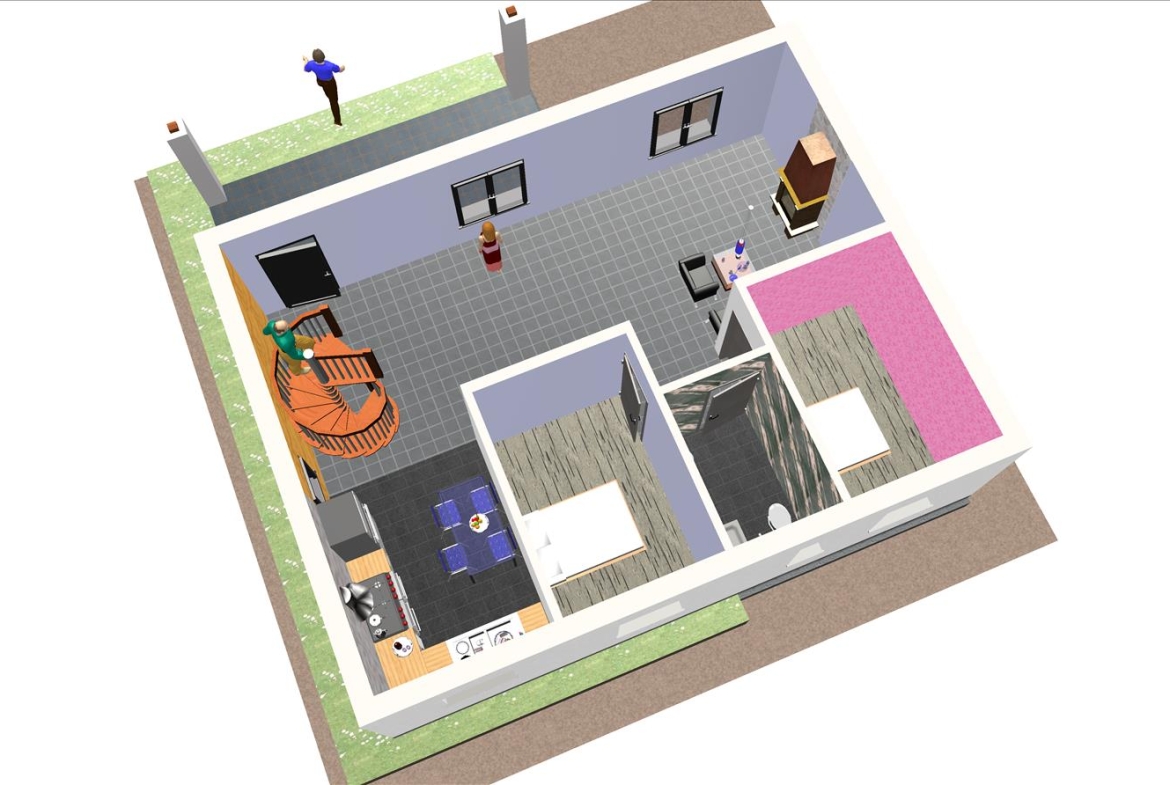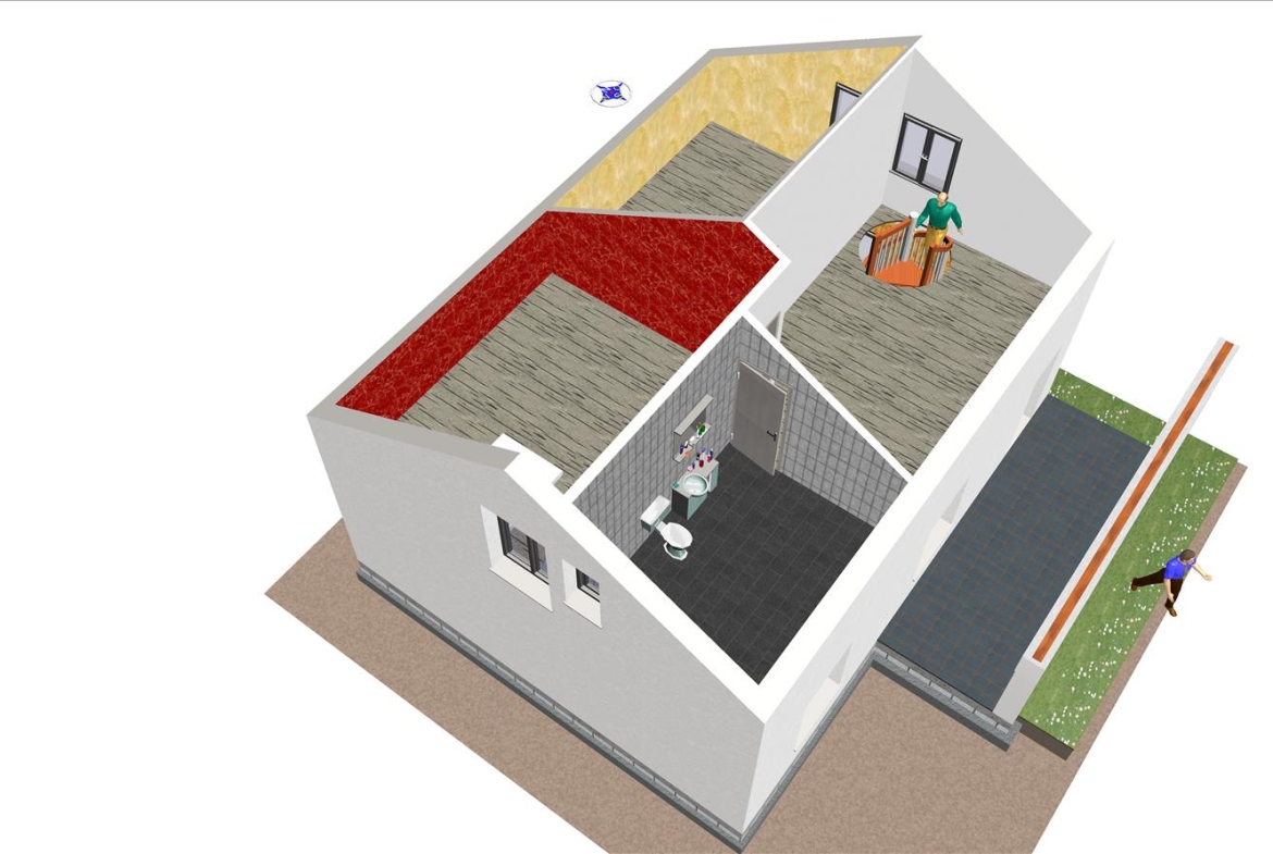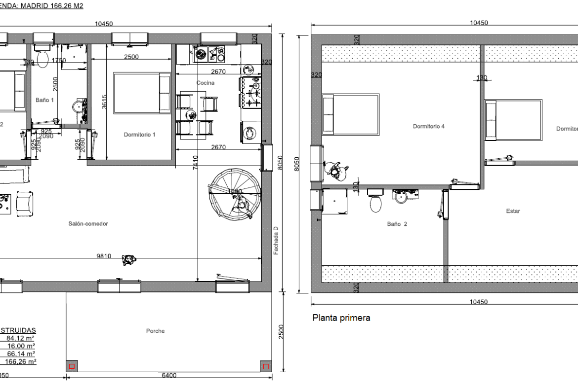 La planta primera de la casa prefabricada se compone de dos dormitorios amplios, sala de estar y un baño.