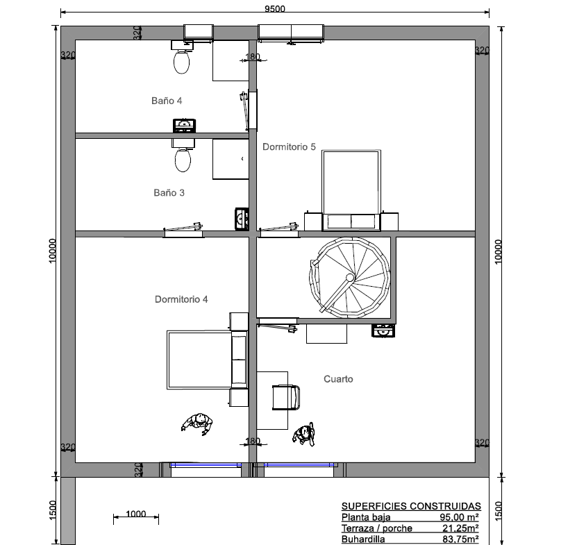En la planta baja, salón-comedor, dormitorio principal con baño, otros dos dormitorios y un baño general, cocina.