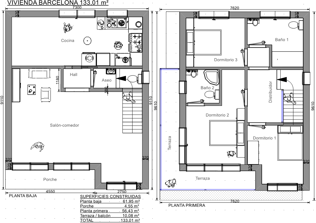 En la planta primera, tres dormitorios, un dormitorio tipo suite con baño y terraza muy amplia,y el segundo lo más amplio.