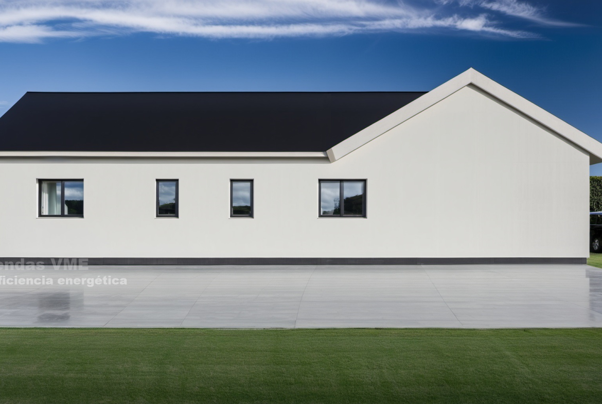 Diseño moderno de esta vivienda prefabricada acabada en hormigón de 4 dormitorios 2 baños y techo a 2 aguas aislado y ventilado, presume de ser l a más eficiente y sostenible.